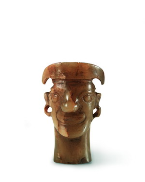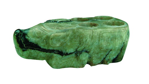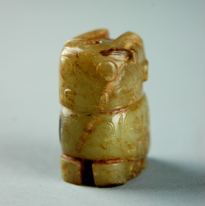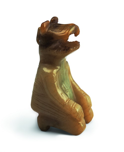 整器将虎头、人身、立鸮巧妙结合在一起,是罕见的玉雕佳品。商周时期的圆雕跽坐人像发现较少,殷墟妇好墓共出土了5件,这件玉人像出土于西周早期的长子口墓,可能是武王克商的战利品,被周王室作为赏赉赐给诸侯国贵族的。