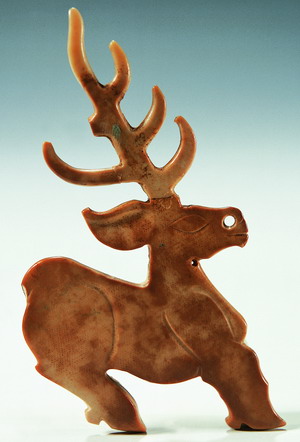 玉鹿是西周动物形玉雕中最具特色的器物,这一时期的动物形玉佩多为片状扁平体,光素无纹,造型简练,善于以夸大局部特征来概括全貌。这件玉佩即在表现鹿的形象时,着力夸大俊美的鹿角,给人一种栩栩如生的感觉。