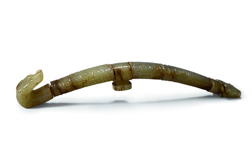 春秋时期,楚国的玉牌、玉佩类饰物在装饰纹样上体现了与青铜器相同的时代特征:龙首纹、蟠螭纹大量出现,勾云纹、卷云纹相互勾连,满布在隐起的兽面、虎、龙等各种形状的图案之上;在工艺技法上使用“阴线刻兼浮雕法”,艺术表现力大大优于商、西周时期的平面阴线刻技法。