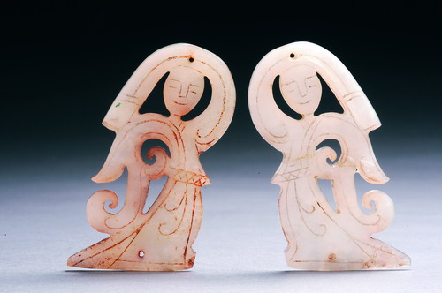 玉舞人佩战国时期已有,盛行于汉代。汉代玉舞人佩均作长袖舞过头顶状,恰如“长袖善舞”之谓;舞姿多变,动态突出;造型概括而夸张,刀法简洁有力。