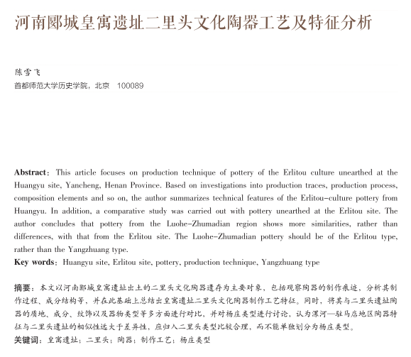 河南郾城皇寓遗址二里头文化陶器工艺及特征分析