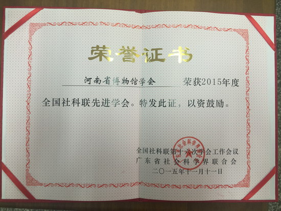 全国社科联第十六次学会工作会议近日在广东召开,河南省博物馆学会荣获2015年度全国社科联先进学会。全国共93家,河南全省仅有3家学会获此殊荣。