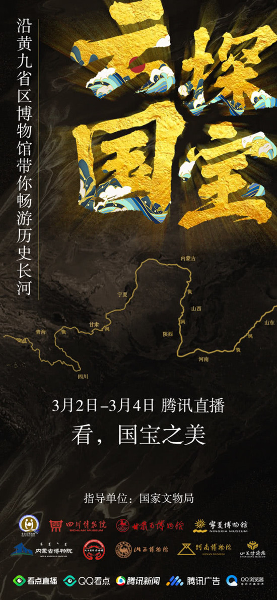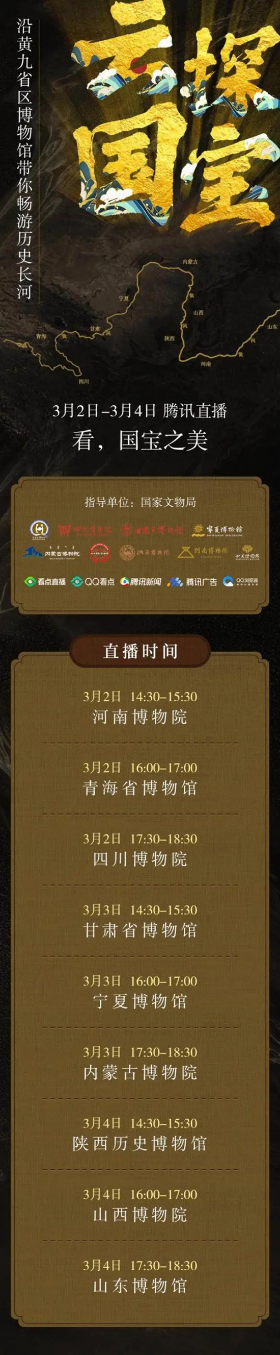 重点来了,从3月2日到3月4日,一天三场,每天三个小时。届时,沿黄九省区博物馆将拿出各自镇馆之宝在线直播,与网友互动,讲解镇馆之宝的前世今生,传播黄河文化。