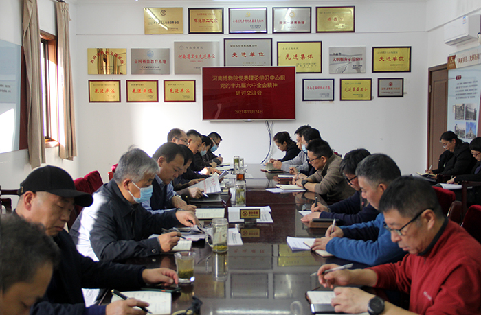 院党委副书记丁福利、纪委书记葛聚朋、办公室主任左俊涛、组织人事处处长司秀琳、财务处处长王海锋做了重点发言,畅谈学习党的十九届六中全会精神的感想和体会,提出了推动工作的打算。与会人员结合学习和工作实际,交流了学习心得和收获。大家一致认为,在建党百年的重要节点,党中央召开十九届六中全会,时机特殊、议题重大、成果丰硕、影响深远。全会审议通过的《中共中央关于党的百年奋斗重大成就和历史经验的决议》,揭示了百年大党成功的密码,吹响了奋进新赶考之路的时代号角,进一步统一了思想、凝聚了共识、坚定了信心、增强了斗志、激发了干劲。与会党员纷纷表示,要从党的百年历程伟大成就中汲取精神营养,牢记初心使命,坚定理想信念,潜心研究新时代文博事业发展的新思路、新方法、新路径,勤勉工作,全力以赴扛起时代责任、担起历史使命,在推动新时代文博事业高质量发展、建设世界一流博物馆中展现新作为新担当。