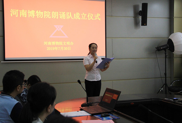 成立仪式在隆重热烈的气氛中开始,参加成立仪式的30名朗诵爱好者来自全院各个部门,有开放区的优秀讲解员、接待员,有古乐团优秀的歌唱者、演奏员,有后勤处的工程师,有文保中心的修复师,有藏品部的保管员,还有财务人员及策展人员等,队员年龄从20出头到年逾六旬,队员构成从普通一线职工到中层干部以及院领导齐聚一堂,共商团队构架,共议团队发展,共筹团队目标。