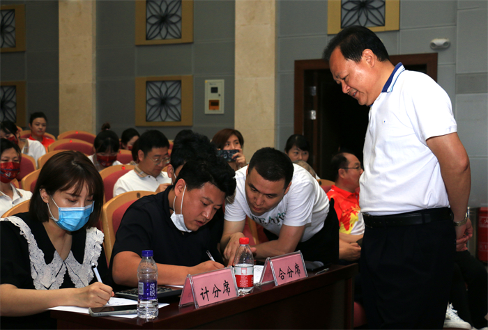 院党委书记万捷(右)等待宣布体操比赛结果
