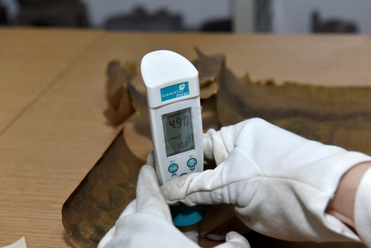 在固始县博物馆,了解了馆藏文物基本情况和库房状况后,对其中的需要保护的近60多件套书画类纸质文物的健康状况做了评估,发现其中大多数文物病害状况属于濒危,保存现状堪忧,需要采取抢救性措施,因此,此次调研采集了57件套书画类文物的具体名称、文物等级、尺寸、色差、白度、酸度、字迹溶解性及部分造纸纤维等信息,将为其编制保护修复方案,及时抢救修复该批文物。