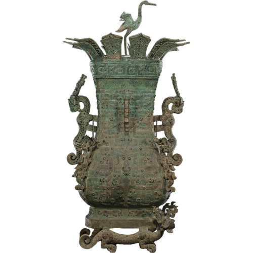 莲鹤方壶,1923年出土于新郑郑国国君大墓。通高117厘米,重64.28公斤。壶身为椭方形,颈部两侧装饰了两条回首观望的龙形怪兽构成双耳,腹部四周四条翼龙仿佛正在缓缓向上爬行,底部两只张口吐舌、侧首回望的卷尾兽,似乎正在倾其全力承托器身。最精彩的还是上层盖顶怒放的双层莲瓣,中央伫立一只引颈欲鸣、展翅欲飞的仙鹤,被郭沫若先生誉为“时代精神之象征”。