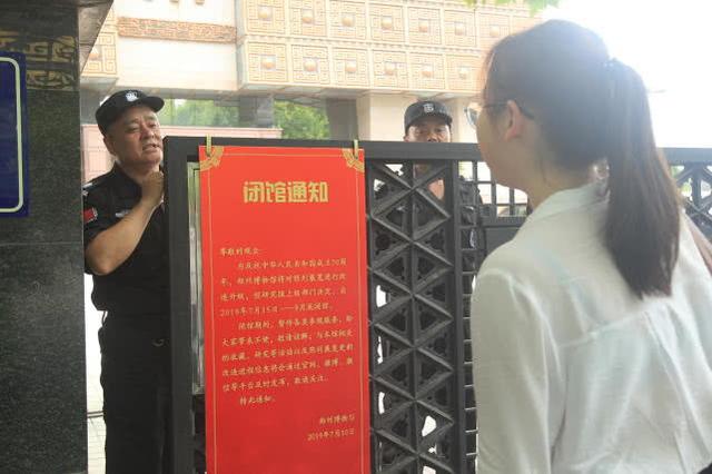 不过,大家的热情被门口一则闭馆通知“浇灭”了。通知显示,为庆祝中华人民共和国成立70周年,郑州博物馆将对陈列展览进行改造升级,经研究报上级部门决定,自2019年7月15日——8月底闭馆。闭馆期间,暂停各类参观服务。