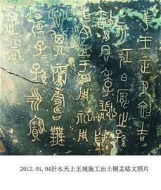 另一件青铜器盂上的铭文字数比芈孟子鼎的多,任相宏告诉记者,这件青铜器上的铭文共7列,每列2字至7字不等,共36字。读序自上而下,从右向左。这件青铜器保存欠佳,破损严重。铭文部位破碎成3片,但文字不缺。利用PS技术对三部分铭文拓本进行拼接后发现,除局部皱褶对接不流畅外,基本上反映了铭文的真实面貌。这件青铜器上铭文中有很多字很难用现代字来表述,但是很明确的是,其中有“邛”字,所以这件青铜器是“邛国”的器物,也是当时这一古国的君王级人物的用物,文字中有“以祺子子孙孙永恒用享”的意思。