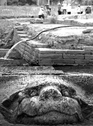 这是在江苏省盱眙县淮河镇城根村,考古人员发掘出的古泗州城一角(2012年7月10日摄)。日前,有着“水下庞贝城”之称的泗州城,经过南京博物院考古所一年多的考古发掘,在因洪水肆虐而被深埋水下330多年后,其西南角部分重见天日,并出土了大量文物。目前,专家正会同当地政府商讨遗址恢复方案。泗州城始建于北周,隋朝时毁于战乱,唐代重新兴建。清康熙19年(公元1680年),繁盛了千年的泗州城在一场持续数十日的暴雨中被彻底淹没。