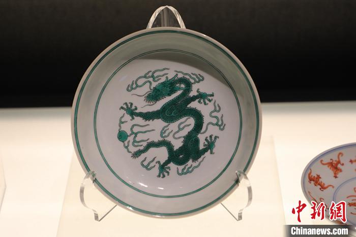 图为清代文物白釉绿彩二龙戏珠纹瓷盘。 邓小强 摄