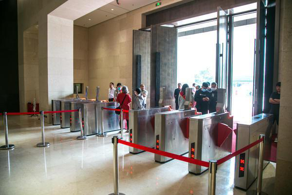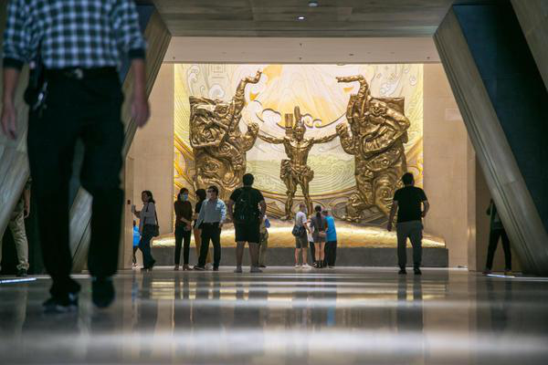 当主展馆揭开“面纱”,可以在主体建筑上看到金色幕墙和深色玻璃窗,简约中透着大气,古朴与现代感兼容,而四神图用黑色图案呈现,拓片质感令人耳目一新。门口,两座石狮分列左右,正门口花团锦簇,绿植修剪得体,主展馆一派“复出”新气象。