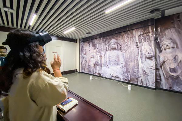 此外,还可以在这里体验动态的《千里江山图》,走进画中感受古风古韵,戴上VR眼镜,还可以360度欣赏洛阳龙门卢氏那大佛景区的优美风景等。