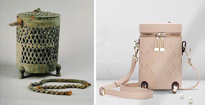 张泽聪连忙摇头笑着说:“我还没有女朋友。当时看到这个汉代筒型镂空铜炉时,我第一眼就觉得这是一个包:文物形状像桶包,提手是包带,炉身上的镂空菱形作为包上的花纹,文物顶部的三角形可以演变成包面上的象征幸运的太阳花印。”