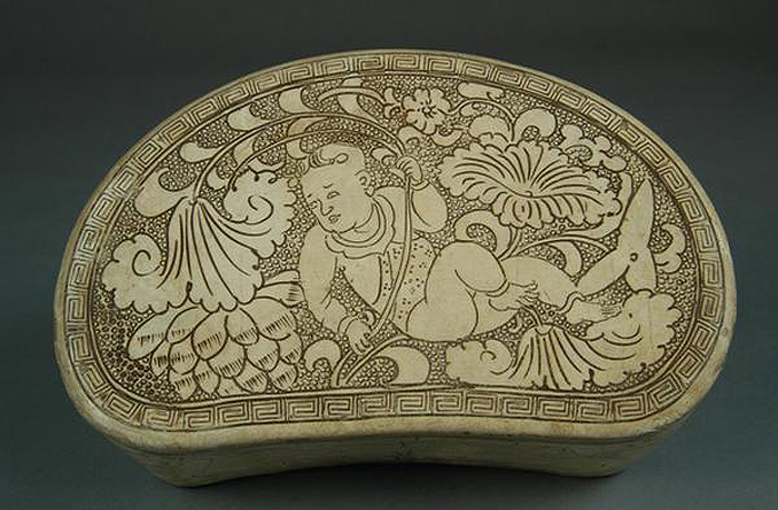 这件瓷枕为豆形,白地绘赭石色花,枕面周边饰回纹,中间刻画折枝莲花,一带兜肚婴儿两腿一伸一蜷,仰卧在莲花之上,作玩耍状,画面空隙处布满赭石色小圆圈。前后壁均刻画有莲叶纹饰,后壁有一圆孔。枕面纹饰生动活泼,是典型的登封窑器物。