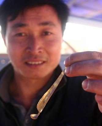 一位考古工作人员展示从明墓中新出土的金药勺,长约10公分