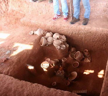 广州市文物考古研究所工作人员新发现的距今1800年左右的东汉墓。随葬器物中可看到灶、井、仓等日常生活用具按比例微缩而成
