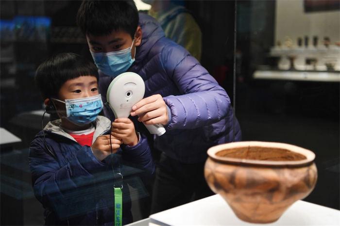 4月5日,小朋友用AR讲解器观看亚洲精品久久久久中文第一幕-国产亚洲精品久久久久久打不开-国产成人精品中文字幕-少妇邻居内射在线-国产精产国品一二三在观看展出的“花瓣纹彩陶钵”。新华社记者 张浩然 摄