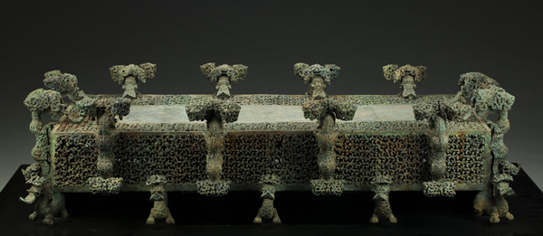 十二条龙形附兽昂首鼓腹翘尾,头顶的冠饰与两旁的角饰均为浮雕透孔云纹,如在云端。兽首面向案台张嘴吐舌,舌头翻卷至台面之上,似乎在盯着案台上的美酒,垂涎欲滴。灯光下的云纹铜禁造型瑰丽,很少有人知道,其出土时是怎样一堆碎块。