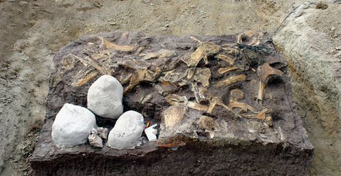 专家初步推断,这可能是一具较为完整的鸭嘴恐龙化石骨架,从现场的情况来看,恐龙在死亡后受到河流冲刷、搬运,被冲到河谷的低洼漩涡处被泥沙迅速掩埋,此后未受地质运动等外力作用的破坏。如此完好的恐龙化石为晚白垩世诸城地区大规模恐龙群繁衍生息提供了有力的佐证。