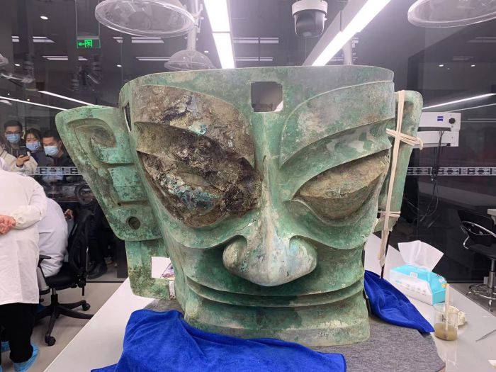 出土后的青铜大面具,有很多地方需要修复法。化夏说,比如面具右眼处附着了很多锈蚀、贝类、泥土的一些硬结物。他们主要用毛刷、钩针、手术刀等工具,对文物外表面进行清理、修复,让文物的外表得到修复和还原。