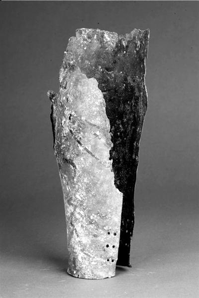 主持宝鸡石鼓山墓地考古发掘的刘军社说,经室内清理和保护后,发现一件残长29厘米的铜甲整体呈卷筒状,犹如人的腿部形状,应是包裹腿部的护甲。在其接口处两边沿上,有卯孔3组,每组6个,其作用应是系住护甲防止脱落。