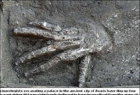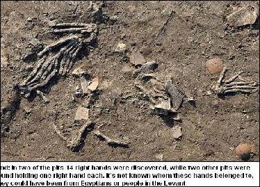 据《每日邮报》8月13日消息,考古学家日前在尼罗河三角洲阿瓦里斯古城(Avaris)一处宮殿下,挖出4個坑,在坑中发现了16只属于约3600年前的巨大人类右手骨骸,证实了一直以來埃及战士“斩手换金”的古老传说。