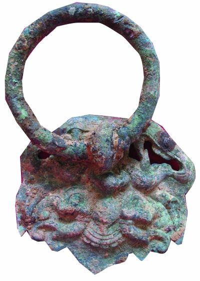 铺首是一种兽面纹样,多为椒图、饕餮、狮、虎、螭龙等凶猛兽类,镶嵌在大门上作为门环的底座,也可不衔环而仅作装饰用,亦可用于青铜器、陶器等器物上安装提手。