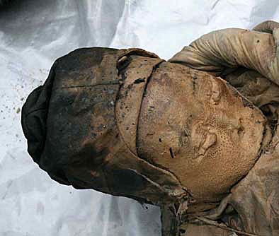 3月1日上午,泰州市博物馆几位专家对保存最完好的一副棺木进行开棺,工作人员花了近2小时才凿开棺盖。开棺后,发现一具尸体被棉被包裹着,浸泡在褐黄色棺液中,液体刚好将尸身全部淹没。尸体身高1.6米左右,脸部轮廓清晰可辨,眼耳口鼻甚至眉毛都完好无损,头顶戴着两层布帽,依稀可见帽上花纹。