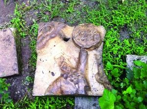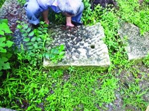 地面上卧着的八九块石头映入了记者的眼帘,韦世林指着其中一块说,这就是他独家发现的“击鼓喊冤石”,石块中间有一个圆孔,侧面有半个圆孔。