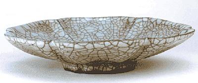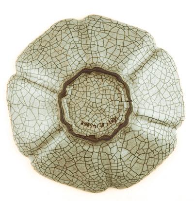 发生损坏的宋代哥窑青釉葵瓣口盘呈六瓣葵花式,通体施青灰色釉,釉面开细碎片纹。圈足露胎处呈黑褐色。此盘造型优雅、大方,线条富于变化,为宋代哥窑的代表作品。