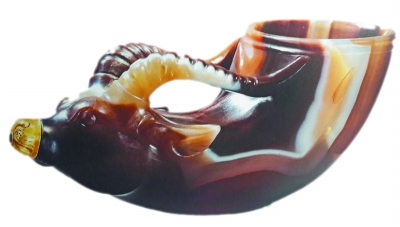 其次,造型独特。杯体前部的雕刻模仿兽首,双眼圆睁,炯炯有神,乍看是一个牛头,但从头上犄角的形状来看,又更像羚羊。兽嘴前处镶金,起到画龙点睛的作用,其实这是酒杯的塞子,取下塞子,酒可以从这儿流出。对于这种奇特的造型,专家学者们普遍认为,是受到西方一种叫“来通”的酒器的影响。