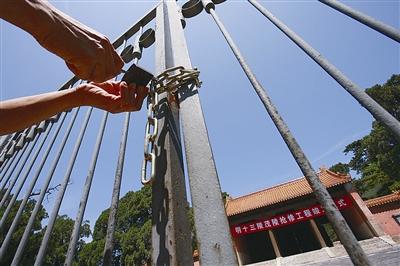 虽然刚刚维修完,茂陵大门紧锁。来十三陵游玩的市民,只能隔着10多米从铁栅栏缝隙看看紧锁的大门。