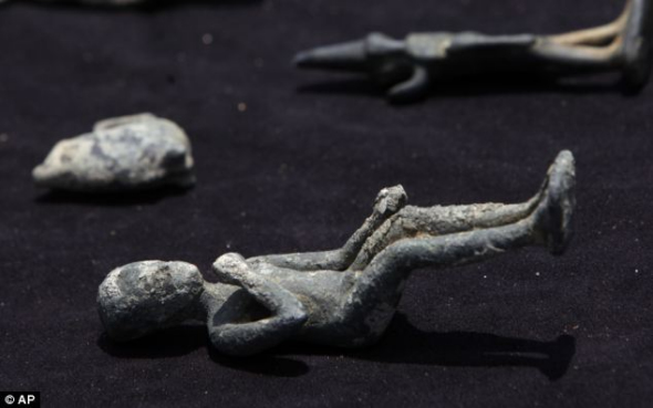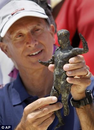 法国水下考古学家弗兰克·戈迪奥展示一个从伊希斯神庙新出土的铜像。