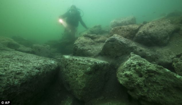 一位潜水人员在察看构成安蒂霍多斯岛伊希斯神庙部分遗址的石灰石块。1000多年前的一场地震让这些建筑物滑入水中。