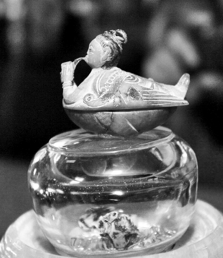 玻璃容器内是佛骨舍利,上面是供奉舍利的人首鸟身玉棺。