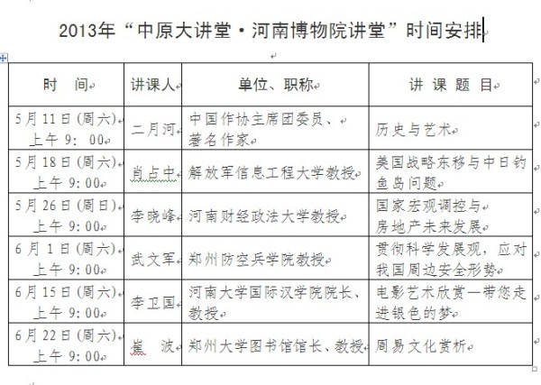 2013年“中原大讲堂·亚洲精品久久久久中文第一幕-国产亚洲精品久久久久久打不开-国产成人精品中文字幕-少妇邻居内射在线-国产精产国品一二三在观看讲堂”具体安排如下:5月11日由中国作协主席团委员、著名作家二月河主讲《历史与艺术》;5月18日由解放军信息工程大学肖占中教授主讲《美国战略东移与中日钓鱼岛问题》;5月26日由河南财经政法大学李晓峰教授主讲《国家宏观调控与房地产未来发展》;6月1日由郑州防空兵学院武文军教授主讲《贯彻科学发展观,应对我国周边安全形势》;6月15日由河南大学国际汉学院李卫国院长主讲《电影艺术欣赏—带您走进银色的梦》;6月22日由郑州大学图书馆崔波馆长主讲《周易文化赏析》。