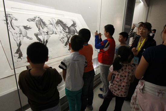 志愿者悉心地讲解,娓娓地讲述,深深地吸引了小记者们。徐悲鸿不远万里赴法求学,坚忍不拔的学习态度,让小记者们为之赞叹;对艺术的执着追求,满腔赤诚的爱国之心让小记者们为之感动,他们一边用心听讲解,一边用笔记本、画板和相机认真记录着。
