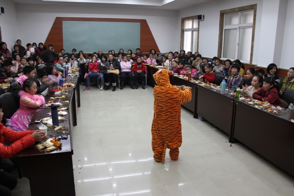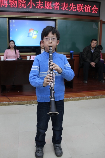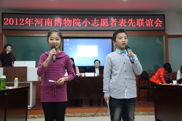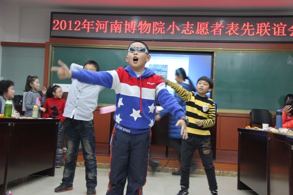 小主持人唐羽和李子昆愉快、掷地有声的开场词拉开了2012年小志愿者新春联谊会的序幕。在两名小主持人的精心策划下,快板、舞蹈、魔术、器乐连奏、歌曲串烧等节目一次又一次将联谊会推向高潮。杜诗琪的诗朗诵《水调歌头》引发了大家诗人情怀,出现集体朗诵的壮观场面;王怡灵嗓音浑厚、中气十足,将一首《少年强》吟诵的高亢激昂,道出了小志愿者的远大理想;丁奕天等三个小伙子则为大家演绎了时下火爆的《骑马舞》;徐文禄,身着虎皮服,连说唱带单簧管吹奏,活泼风趣,引得大人孩子捧腹大笑!