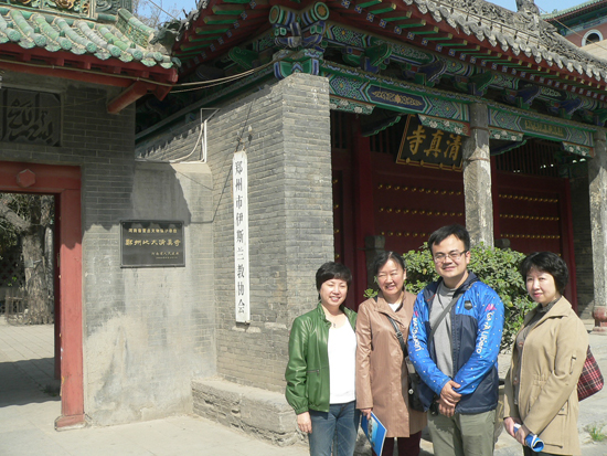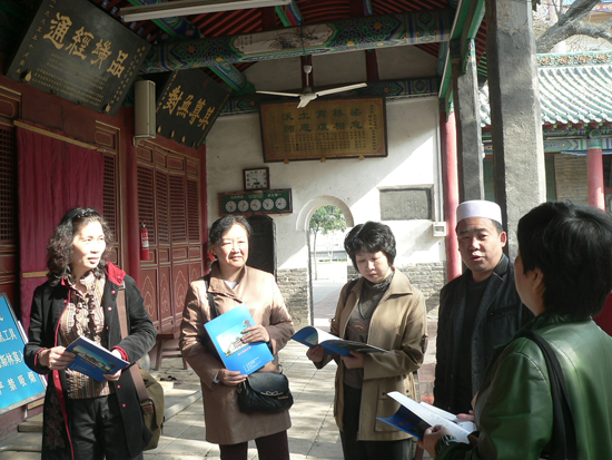 李阿訇(右二)为志愿者们讲解郑州北大清真寺的历史