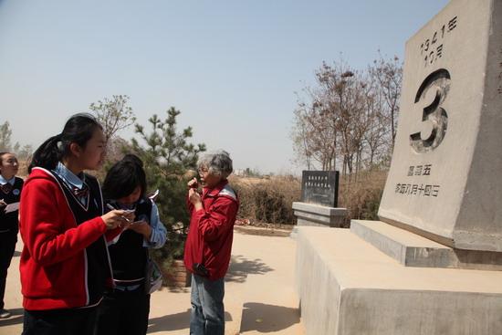 在上河王村日军大屠杀纪念碑前,郭桂兰老师慷慨激昂的讲解将同学们带回到那段烽火连天的岁月。1941年10月3日(农历8月14),侵华日军袭击上河王村,杀戮手无寸铁的平民84人,(其中)妇女儿童被逼跳井者20余人,焚烧房屋无数,致使尸横遍地,血流成河。郭老师讲到最后向同学们倡议“今天是清明节,让我们为当年无辜惨死的84位同胞鞠上一躬,也请大家谨记为中华之崛起而读书”。郭老师的话落,同学们集体肃立,向84位遇难同胞深深地鞠了一躬。仇恨可以融化,历史不能忘却。