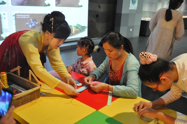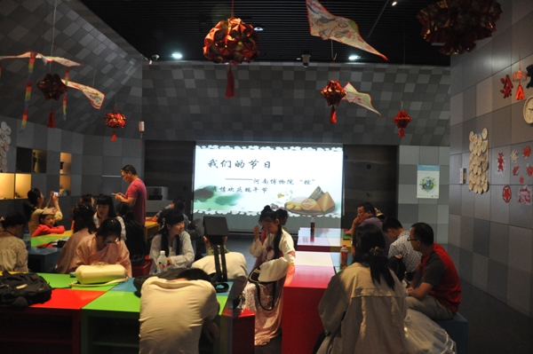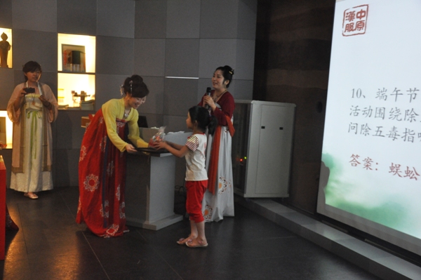 亲子家庭成员按照要求刚刚坐下,这个时候身着各色汉服的“古人”在孩子们惊奇的目光中入场,拉开了主题活动序幕。活动由三个部分组成:端午节小知识《端午来历及习俗》、亲子互动、趣味问答。活动中,孩子们认真听老师讲解端午节的来历以及习俗。根据孩子的特点,老师在讲解的过程中穿插了小故事和互动游戏,使活动在热烈的气氛中有序的进行。知识小讲座结束后,孩子与家长一起动手制作五色丝、五彩粽子。活动让观众热情澎湃,掀起了一个又一个高潮,小朋友和家长们都在尽情享受着博物馆带给他们的快乐。为了让孩子们能更好地认识传统节日,辅导老师以“我问你答”的方式组织孩子们进行了一场端午节有奖知识问答,亲子家庭在这种其乐融融的氛围里度过了一个节快乐又别具意义的端午节。