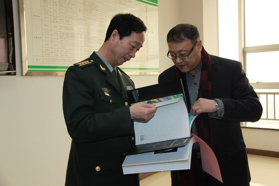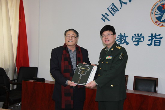 张文军(左)向解放军信息工程大学网络空间安全学院赠送展览图册