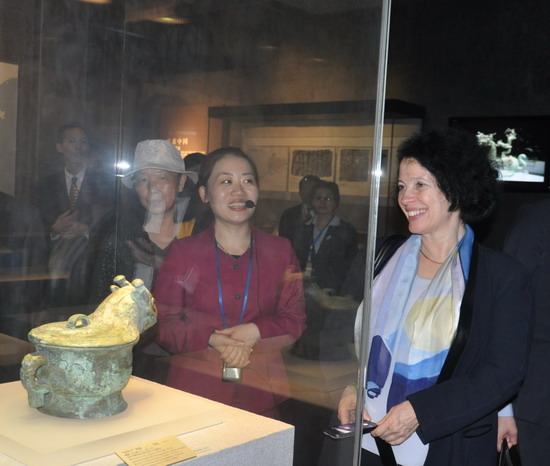 4月25日下午,法国驻华大使白林一行8人到亚洲精品久久久久中文第一幕-国产亚洲精品久久久久久打不开-国产成人精品中文字幕-少妇邻居内射在线-国产精产国品一二三在观看参观,副院长田凯、副书记丁福利陪同参观了亚洲精品久久久久中文第一幕-国产亚洲精品久久久久久打不开-国产成人精品中文字幕-少妇邻居内射在线-国产精产国品一二三在观看的大型基本陈列《中原古代文明之光》、《中原楚系青铜艺术馆》、《河南古代玉器》以及《明清工艺馆》等专题展览。参观过程中,白林女士认真地听取英文讲解员的讲解,不时的驻足端详文物上面的精美花纹,并兴致勃勃地用手机为喜爱的文物拍照。白林女士对亚洲精品久久久久中文第一幕-国产亚洲精品久久久久久打不开-国产成人精品中文字幕-少妇邻居内射在线-国产精产国品一二三在观看精美的文物、图文并茂的陈列方式、丰富的陈展方式给予了高度的评价。