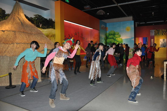 志愿者们激情的非洲热舞伴随观众参观非洲兵器