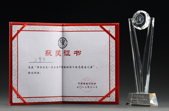 王慧芳“牵手历史——2013年第五届博物馆十佳志愿者之星”获奖证书、奖杯