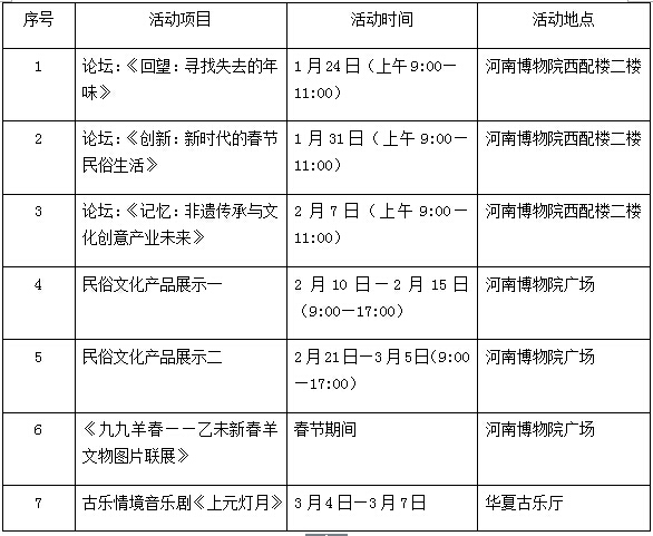 “展示”部分从2月10日至3月5日,围绕“记忆”、“非遗”、“体验”和“文创”为主题,把朱仙镇木板年画、中国结、剪纸、平洛牡丹村书画、民权老虎画、浚县泥咕咕等近50个极具特色的传统技艺类非遗项目集聚在一起向公众普及。此外,“九九羊春——乙未新春羊文物图片联展”也将于春节期间推出,通过羊文物所代表的国泰民安寓意,积极向上的精神,宣传中国传统生肖文物的艺术性、文化内涵,向公众普及生肖文化知识,寓教于乐。享誉海内外的华夏古乐也将在春节期间继续奏响,在农历正月的十四、十五、十六、十七日向全社会推出古乐情境音乐剧《上元灯月》,让市民一品中原民俗、过足文化年味,打造一个别开生面的中原年俗文化盛会。