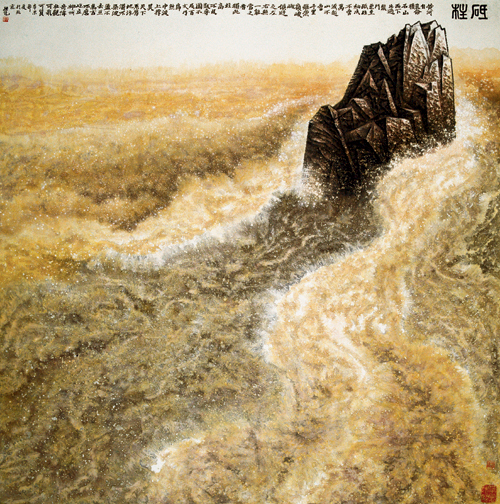 《砥柱》(题跋:黄河自昆仑积石山而下,北过龙门,东至砥柱,纳水不啻万流,越山不啻千里,虽崇岭峻巘,俱避之左右,无一能当之者。独此柱高不及数寻,围不及百丈,乃归然中流。上撑昊天,下系厚地,污浊不染,波荡不去。亘万古不磨,屹立神州,奇伟壮观,可歌可赞。辛未年夏于北京张凭)