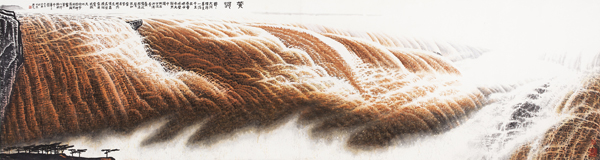 《黄河》(题跋:莽莽大河,横跨华夏,一泻千里。出秦晋峡谷,峭壁参天,豁然中阙。漱石分流,洪涛层叠,惊波骇浪,声激如雷,势若蛟鸣虎啸,万马奔腾。烟雾凌霄,威撼天地,境势情神,浩然荡胸,奋笔以抒振兴中华之怀。壬午初春于北京张凭)